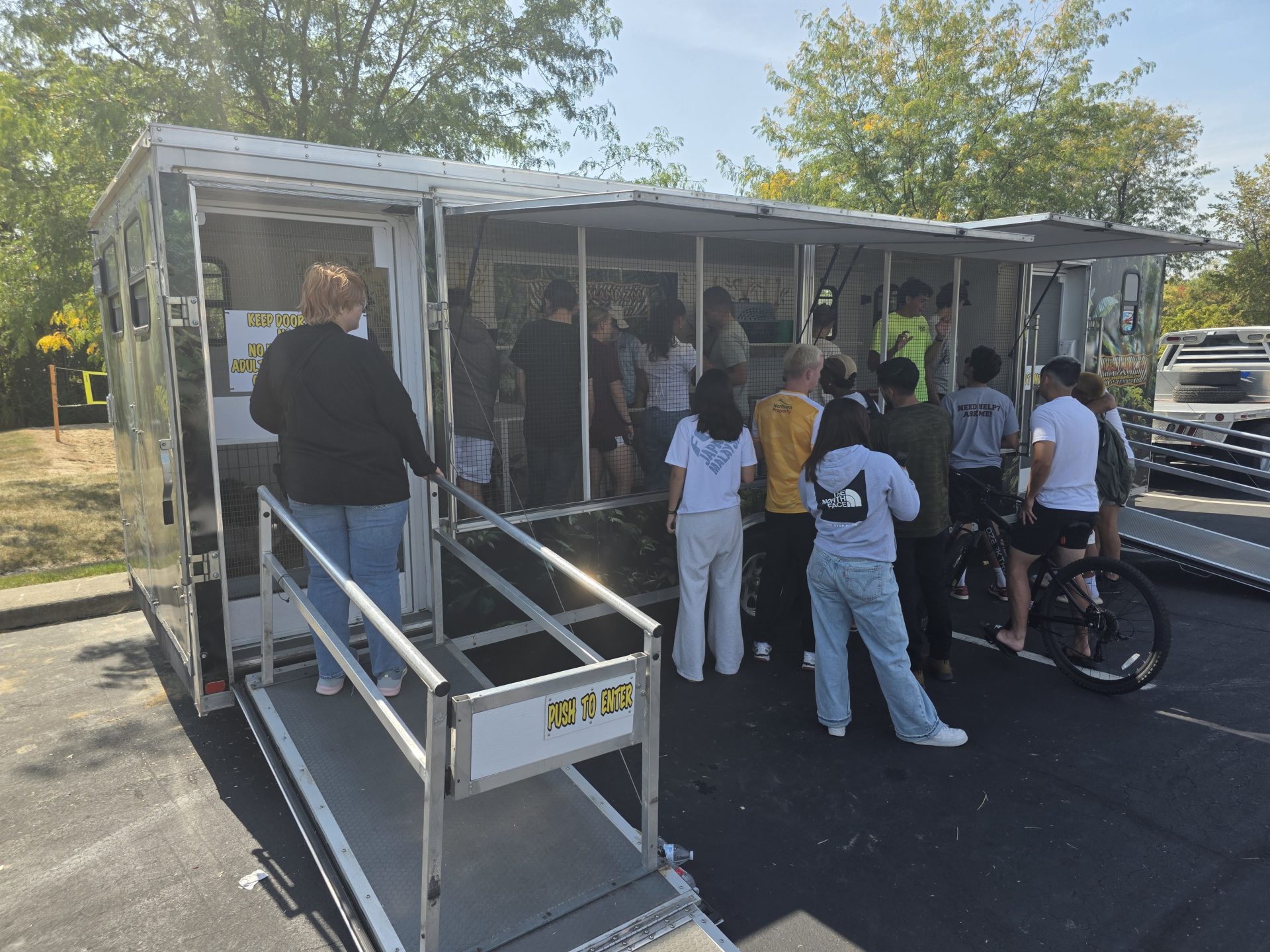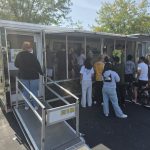 The CUDDLE SHUTTLE trailer footprint requires a dry, firm and level surface 15 feet wide (ramps deployed) with a “frontage” length of 35 feet. An additional 25 feet in length is necessary to accommodate the tow vehicle when parked. Adequate room for maneuvering into place needs to be considered, as well. A 110 volt receptacle is preferred but a mobile generator can also be used.